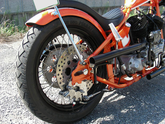 ハーレーの旧車に詳しくない人から見れば2サイクルエンジンのように思えるエンジン、サイドバルブです。ヘッドカバーはスチール製の空冷フィンの低いタイプのもので、アルミ製と比べビンテージテイストをより強く感じることが出来ますね。さらに、タンクの小さなチョッパーでは、タンクとエンジンの隙間がより大きく表現できるのでこれぞフラッティー・チョッパーだと感じさせる仕様でもあります。フェアバンクス製のマグネトーはベース車のモノを調整して再利用、シンプルなショットガン・マフラーはパイプを切った貼ったしたワンオフものでシンプルな造作に好感が持てます。