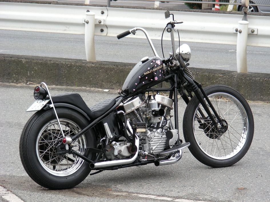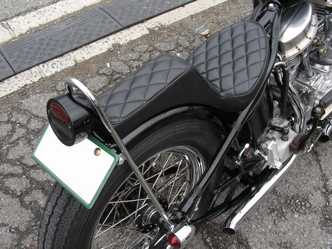 74スプリンガーフォークはスプリングのみクローム仕上げとなり同色のベイツタイプのヘッイライトとバランスをとっています。シックス オリジナルトップティーにショベル用のライザーを組みパウコ製のエイプバー ハンドルを合わせ、旧車チョッパーではあえての外出しアクセルワイヤーと操縦性を優先させたチョッパーイメージを演出しています。全国で爆発的ヒット商品となったナイス!製のダイヤモンドグリップはシートのパターンと合わせてチョイスされています。