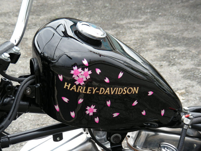 アイアンショベル用の純正スポーツスタータンクはフォルムには手を加えず無地のキャンバスとしてオーナー唯一のオーダーであるサクラ吹雪をコンチネンタル氏の入魂の一筆として表現しています。オーナーが男性であるということ、ピンクを必ず入れて欲しいという意向、さらに旧車チョッパーでもあることなどペイントにはかなり苦戦したようです。走行風に煽られて前から後ろへとチラホラと舞い散るように描かれたサクラが趣き深いものとなっています。