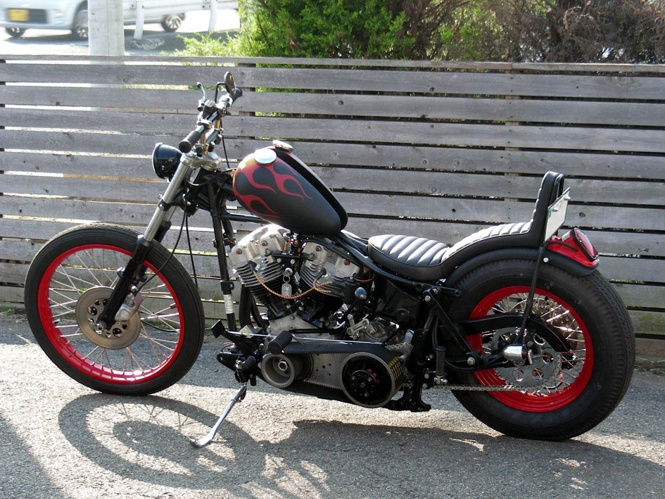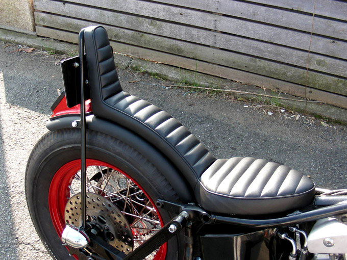 ずいぶんと前に自社製品として発売したが、業界的にもユーザーにもガン無視されたシックス・リジッドバーでスイングアームを固定させ、フラットフェンダーを無理なく装着できるようにしてある。ストレートに伸びたシッシバーに合わせてワンオフ製作された実におさまりの良いロングシートが、このチョッパー最大の見せ場だ。ちょい上向きのティムストーンランプはレッドカラーにペイントされ、リアスタイルのポイントとなっている。 |