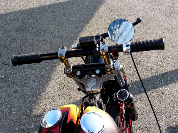 FLHに純正装備されていたライザーに3インチ・ドッグボーンライザーを更に組み合わせることによって、ほど良い高さとハンドルの自由自在な角度を調整できるようになる。そして極端に幅の狭い真一文字のストレートハンドルの中央にはグリメカのブレーキレバーを装備。小さなミラーも取り付け位置からすればライダー自身の顔ぐらいしか映らないと思うが、それも含めて当然のノリである。 |