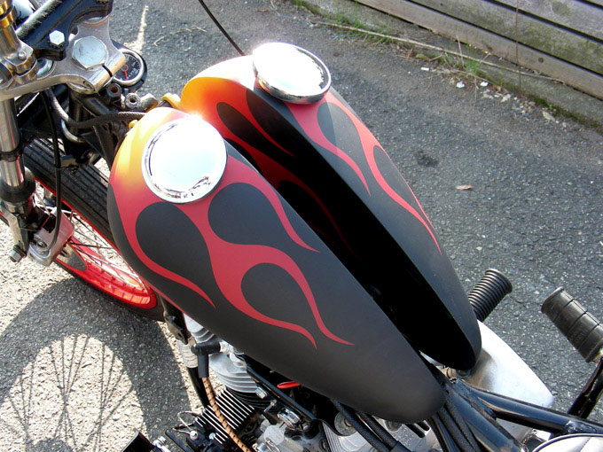 社外のエッグタンクをセンターからまっぷたつに割って、セパレートタンクに加工。取り付けた場合の横幅は加工前とそれほど違わないと思うが、ガソリンタンクのイメージは大幅に変化した。「ロッド&カスタム」テイストでつや消しの特徴的なペイントは、おなじみ飴色塗装店の手によるもの。深みのあるキャンディカラーを得意とする同店からすれば、さぞやりにくい依頼であったはずだ。 |