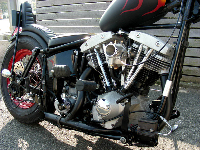 エンジンユニットはシリンダーとタペットブロックのみがブラックペイントされ、いかにも無骨なショベルらしい雰囲気に仕上がっている。キャブはエアクリーナーレスのS&S社のBキャブで、ステップ位置もかなりハイマウントだが、このような仕様もノリで選んだ。最後まで悩んだのがマフラーでなんとか2イン1スタイルまでは決めたのだが、エンド部のカタチが決まらない。最終的にはお約束パーツであるターンアウトにした。 |