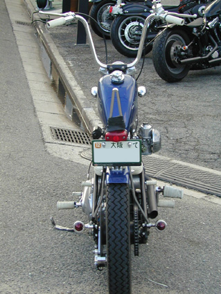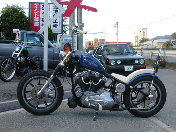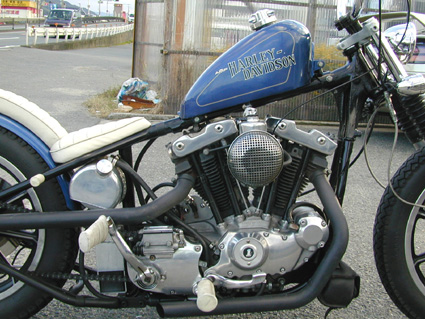 ・」で紹介されたので御存じの方も多いでしょう。 1979年のアイアンショベルをベースにフレームをリジット加工,リアが18インチサイズのノーマル車が持つスポーティなイメージをチョッパーに反映させました。 カスタムの発端は現オーナーが旧車で有名な船場さんで程度の良い純正タンクを偶然,手に入れたことでした。前オーナーによってピーナッツタンクが装着されていたのを,ノーマルのカッコ良さを強調する方向で,タンクを中心に全体のイメージ作業を進めました。 最初は70年代の香りが感じられるお洒落なバイクを目指していたのですが,エイプハンドルを付け,ホワイトシートを乗せるというふうに製作が進んでいくにつれて,だんだんとアウトローイメージの強いものとなっていきました。 しかし,このことは製作スタッフにしてみれば予想外の良い出来となり,もちろんオーナーにとっても,うれしい誤算でありました。 首尾一貫したイメージで最後まで完成させるだけでなく,製作段階でいろいろとアイディアを出してみたり,良いと思えばイメージの方向性を変化させるのも,おもしろい結果が出るという好例だと思います。 オーナーは今年の夏にこのチョッパーに乗り北海道に旅に出ました。私も同行しましたが,今年の北海道は稀にみる冷夏で旅の最初から最後まで雨と寒さに,たたられることになりました。北海道でフロントフェンダーが無いので泥だらけになった,このバイクを見かけた方もいらっしゃるかも知れませんね。 |