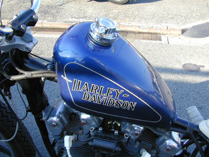 79年式の青ラメ塗装の純正タンクが美しいですね。やはり,スポーツスタータンクは小型のものがチョッパーには断然似合います。タンクロゴは同年式のローライダーと同じタイプのものがスポーツスターにも使われていました。 フレームの取り付け位置を加工してタンクをハイマウントに装着。前すぎず,下がり過ぎでもない絶妙なバランスを保っています。 タンクキャップカバーは通称サザエと呼ばれるタイプ。使用されているものはハーレーダビットソンが72年から82年まで発売していた純正品です。社外品とはトップの窪みと重量感のある質感が違います。このようにパーツをこだわることで,カスタム全体のクォリティを高め,より良いバイクを製作するのです。 |