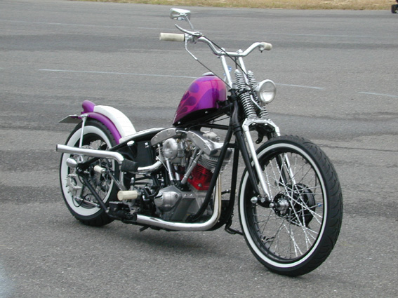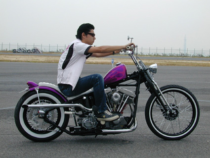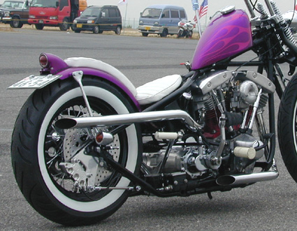 一際,目を引くこのチョッパーは,1980年式FLをベースにハードテイルキットを組み込んで,ホットロッドテイストを注ぎ込んだ1台です。 まだ若いオーナーのイメージするところの50〜60年代のアメリカのホットロッドスピリッツをショベルチョッパーに反映させました。 もともとベース車がベルトプライマリー仕様でミッションなどが社外品のカスタムバイクだったのでそれを極力活かしたプランで進めることに。 74スプリンガーはメッキとブラックの2トーンカラーを選択。あえて,リムは赤く塗らずに,ツイストスポークとホワイトウォールタイヤとのセットアップで雰囲気を出しました。 7インチポストライザーにスーパーバー,この手のお約束はちゃんと押さえます。 もちろん,ミッドステップのハンドシフトでスーサイドです。 しかし,このバイクの注目点は各部のカラーリングが演出する,不良っぽさを感じさせる雰囲気でしょう。 ブラックフレームにメッキのパーツ,ラバーパーツやシートはホワイトで,なにより派手なパープルフレイムの外装が当時の妖艶な空気を再現してくれます。 加えてポイントカラーのシリンダーの燃えるような赤色がアウトローさを増長させているようです。 遠方に住んでいるために,製作の進み具合をVIBESの広告でしか知る機会のないオーナーでしたが,完成車は彼のイメージを上回る出来だったようで,たいへん喜んでくれました。 |