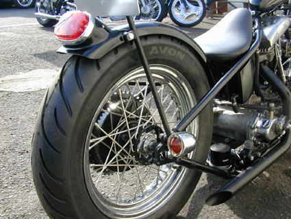 タイヤの幅に合わせてフラットフェンダーも幅つめ加工が施され,それに合わせて,ほど良い長さのシンプルなシーシーバーを装着。これもまた定番のデュオテールを斜め上に向けてマウントできるように切断加工。ソロシートも装飾のないあっさりしたものですがパーツのコーナーで解説したことのある例のシートです。 このバイクはシックスモーターサイクルで製作されたチョッパーの基本ベースをそのまま前面に押し出したものです。いつも同じようなバイクを製作しているようですが,ワンパターンが逆に個性を感じさせることもあるのです。 |