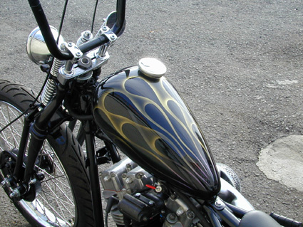 ブラックベースのマスタングタンクにはエンド部分にパープルがアクセントに加えられたパールゴールドのぼかしフレイムペイント。 ブラックだけのシックなカラーだけに,このタンクの美しいフレイムペイントがより効果的に映えて,このバイクの見せ所にもなっています。 シックスモーターサイクルではこのような塗装は腕の良いペイントショップと提携しているのですが,オールドチョッパーから同じ大阪のHead Bllowの製作するハイテクチョッパーまで手掛け,すばらしいセンスで我々の期待に答えてくれます。 |