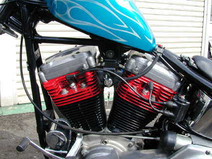 アルミ地のエンジンはお化粧直しを兼ねてシックスモーターサイクルでは毎度の仕様の上が赤で下が黒のペイント。この色分けはスタッフが昔,あるアウトロー写真集をみてこれはカッコイイと始めたものですが,私は良い意味で下品で悪っぽくてとても気に入っています。 写真には写っていませんがハンドルまわりも同様の雰囲気に合わせてコズミックの6インチH型ライザーにノーマルの4インチライザーをエクステンション。もちろんスーパーバーを使用しています。ブレーキマスターおよびレバーはカワサキW650の純正品を流用。ハンドルのサイズも同じで丸くシンプルなデザインなので当店ではよく使う手法です。 |