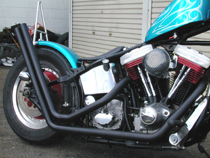 このバイクを見て一番に目に入るのは,やはりこのマフラーでしょう。オーナーは「お任せしま〜す」の連続でしたが 会話のノリでこのスタイルを理解してくれるオーナーと判断して,ドラックパイプを切った貼ったしてワンオフしたものです。昔のアメリカのアウトローはこのような奇抜なスタイルのマフラーを愛車に好んで装着していました。このタイプのマフラーは人が乗るとよりいっそう見栄えがするので,走行中のスタイルの良さは筆舌ものです。そのような事柄をふまえてこのマフラーをカッコイイスタイルになるように製作しました。ブラックのペイントがワイルドな雰囲気を強調しています。 もちろん,事後承諾でマフラーの形状はオーナーに了解をとってありますが。 |