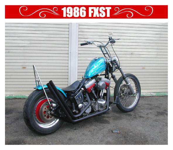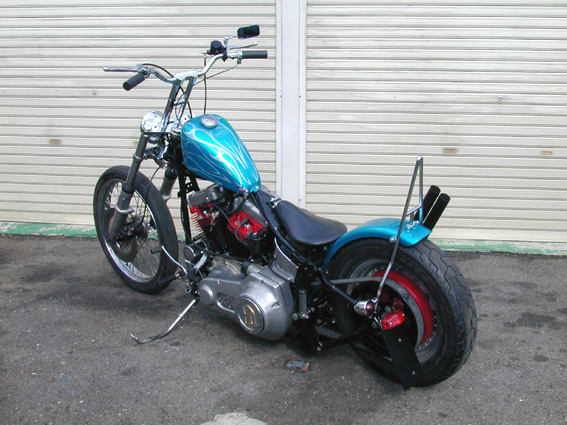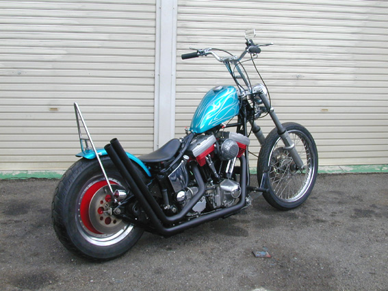 このチョッパーは東京在住のオーナーが電話のみでベース車を購入しカスタムも発注したという経緯をもっています。我々がオーナーについて知っているのは年令と身長のみ。どのような顔なのか,もちろん好みも知りようがありません。 カスタムイメージもオーナーいわく「お任せしま〜す」。スタッフ「カラーはどうしましょうか?」,オーナー「お任せしま〜す」スタッフ「マフラーはどのようなものを?」,オーナー「お任せしま〜す」。 以上のような無意味なやりとりの後,それならオーナーが,びっくりするようなカッコイイバイクを造ってやるか,となりスタッフが自由に腕を振るい製作したバイクです。 やはり,チョッパーはアソビ心が無くてはできません。 ベースが86年のエンジンがアルミ地のソフテイルなので,その媚びない硬派な雰囲気を利用したチョッパーイメージを心掛けました。特に目立つマフラーデザインも含めて全体のイメージは60年代後半ぐらいのアウトローな雰囲気を,エンジンやリアホイールのカラー,タンクのペイントなどは現代の流行を取り入れてあります。 一見ラフな雰囲気で製作されているように感じられるかも知れませんが、ハンドルまわりなどは,ミニスイッチを使用したりW650のブレーキマスターを流用等,細かい部分まで手を抜いてはいません。 |