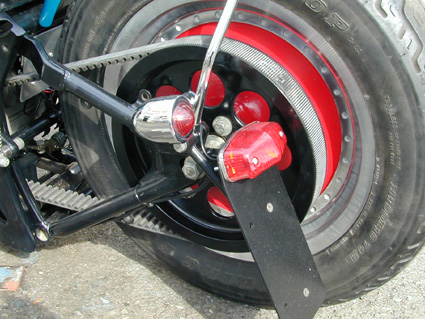 この車両はソフテイルスタンダードなのですが,ディッシュホールが装着されていましたので内側を赤くペイントしてイメージアップ。それに合わせてベルトプーリーも黒で決めてホイールとのタイアップを計っています。 ストップライトは定番のルーカスタイプを使用。ナンバープレートと共にサイドマウントとしています。取り付け方法も裏面ゆえ見えませんがスチールパイプの曲げ加工でさりげなく凝っています。 シッシーバーもメッキのスタンダードなタイプを車体に合ったサイズでワンオフ。 3月にオーナーが新幹線でやって来てこれからの自分の愛車となるこのバイクを見た時のリアクションが今からたいへん楽しみです。 |