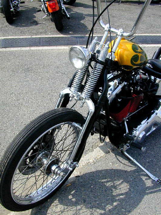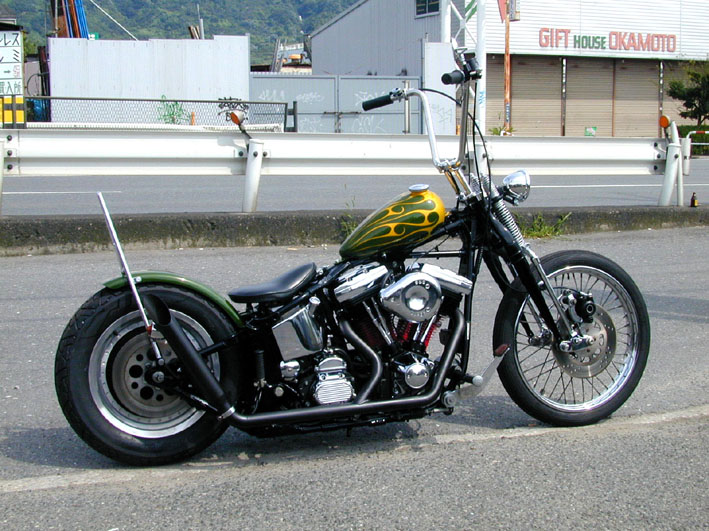 1991年のスプリンガーソフテイルベースのチョッパーです。 このチョッパーのオーナーは,このホームページのCUSTOM BIKESのコーナーで以前紹介しました,東京在住の1986年式のFXSTカスタム所有の「お任せしまーす」氏の友人だそうです。聞きかじりなのはやはり,彼も東京在住で友人が当店でカスタムしたソフテイルチョッパーを見て,ありがたくも気に入り「それでは,俺もシックスモーターサイクルでバイクを買ってカスタムするか。」というような感じで電話にて全てをオーダーしたからにほかなりません。そういうわけで,関係者一同,誰も彼に会ったことがないのです。 しかし,今回は「以前に製作したソフテイルチョッパーに似た雰囲気のカスタムを」という依頼でして,それならオーナーの好みというかノリが分かるので,製作はスムーズに運ぶはずでした。オーナーから,「ある言葉」を聞くまでは。それにつきましては,下で述べていますので一読下さい。 シックスモーターサイクルでは,この製作費40万円カスタムタイプのスプリンガーチョッパーをホームページに載せていないものまで含めると2〜3台製作しましたが,もともとソフテイルフレームにスプリンガーという組み合せのせいか,少し外装に手を加えただけで,たいへん見栄えの良いチョッパーになりました。 もともとハーレー本社がチョッパーのイメージを強く意識して発表したモデルでしたが,本来チョッパーというものはアウトサイダー的イメージが強くありました。しかし企業としてはそれをベースにしながらも,誰でも扱える利便性,保安基準というようなことを念頭に置いた,工業製品としてのチョッパーを販売さざるをえません。このような本来のイメージとは相反するが,売るために手を加えねばならない「メーカーとしてのジレンマ」があります。 |