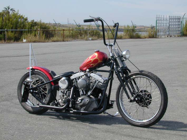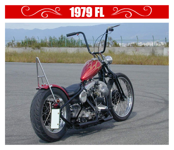 オーナーは市バスの運転手でして,以前このホームページにも紹介しましたブラックにゴールドフレイムの1978FLショベルリジットチョッパーをとても気に入り「市バスは同じコースしか走れないのでストレスが溜まる。カッコイイチョッパーで自由自在にカッ飛びたい。ぜひ,同じ様なセットアップでカスタムをしてほしい。」という注文でした。(一部,勝手な想像が入っています。) 秋の大阪ジャンボリーで納車となりオーナーは喜び勇んで練習をしていましたが,ジョッキーシフト初心者なのにスムーズに乗りこなしていました。やはりこのタイプのコンパクトチョッパーは扱いやすいですね。オーナーの体型に合わせて製作しますので,ポジションもタイトで身体にしっとりと馴染みます。 シックスモーターサイクルの造るチョッパーはとてもシンプルで,フレームと二つのタイヤの間にエンジンが乗っているという基本に忠実な造作です。 |