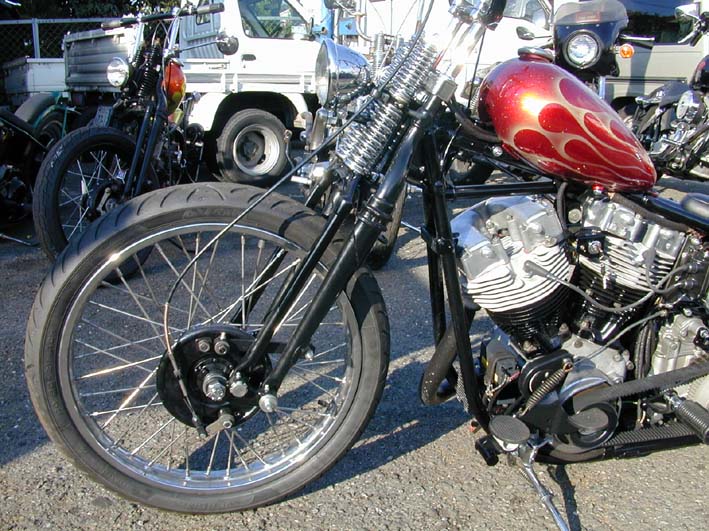 | オールブラック塗装の74スプリンガーフォークでスプリングはメッキ。 メッキライザーやブラックのハンドルバー・ドラックマフラーとのカラーバランスを考えての選択です。 アナログレコードのような小さなドラムブレーキもこのチョッパーには良く似合っています。もちろんブレーキの効きはたいして期待できませんが,チョッパーだからこそスタイル絶対主義でいきたいからね。 |