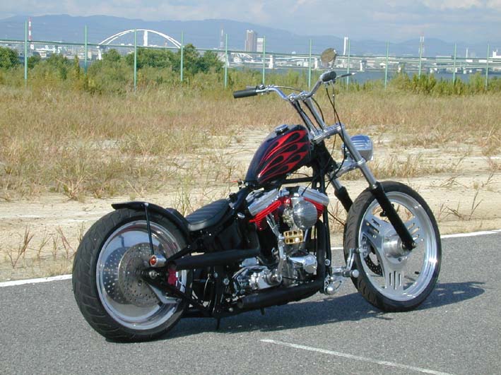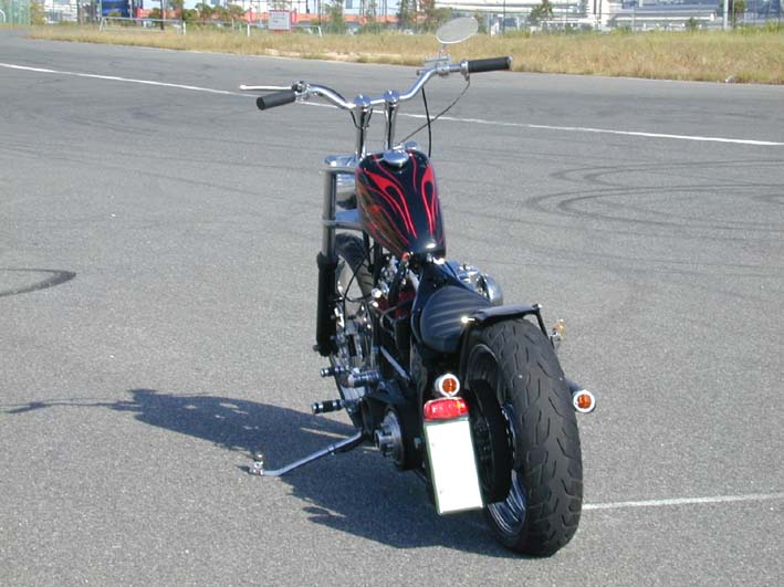 秋の大阪ジャンボリーで納車になりましたソフテイルカスタムベースのチョッパーです。もともと前オーナーによってかなり改造されていた車両でしたが,カスタムの内容が10年以上前に流行ったスタイルだったので,正直このままお店に並べても売れそうにないと判断,使えるパーツだけ残して後は新規で,しかも時間の都合上,超特急でカスタムしたものです。 シックスモーターサイクル流のコンパクトなスタイル実現のために外装は惜しげもなく全て破棄,やれていたフレームもブラックに再塗装。ローダウンされたボトムケースは再使用しましたが車体の雰囲気に合わせてブラックに。トリプルツリーは以前,注文の手違いでずっと倉庫に眠っていた昔懐かしのNESSの製品で不良在庫処分のために取り付け。ハンドル周りは高めのライザーとスーパーバーハンドルでカタチを整え,小型スイッチや配線のパイプ中通しで細部を造り込んでいます。 社名不明のビレットフォワードキットと一昔前によくカスタム雑誌で見たことがあるようなフロント21インチのアルミホイールやリア18インチのワイドデッシュホイールは再利用。赤いアルマイト仕様のパフォーマンスブレーキも車体のカラーに合っていたのでそのまま使っています。 以上のような安価なベース車を利用し,リサイクルパーツを多用して軽〜く造ってみたエボチョッパーですが,シックスモーターサイクルでは目一杯のハイテック仕様のつもり。「ワイドタイヤと言いつつもサイズ150@しかないぞ。」「でもリジットだろう。」,「なぜキャブがSUなのか?」,「リアウインカー位置が左右非対称な造作なのはどうして?」等いろいろな部分で,力の抜け具合を物語っています。 しかし,こうやって無事完成してみるとなかなかサマになっているではありませんか。ちょっぴり不良のエッセンスが効いていてミーティング会場にいっても恥ずかしくないハイ&ローテックアウトローチョッパーです。 |