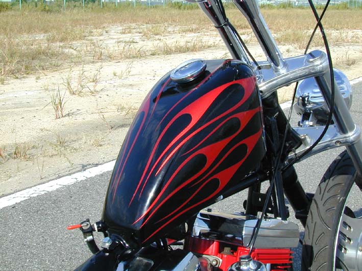 スリムなイメージを演出するノーマルサイズの社外スポーツスタータンクです。他のビックツインに比べて迫力あるアルミのエボエンジン以降はバランスを考えるならば,この程度の大きさのタンクで十分よいのではと思えます。 カラーはシンプルなブラックベースにキャンディレッドフレイム仕様。 |