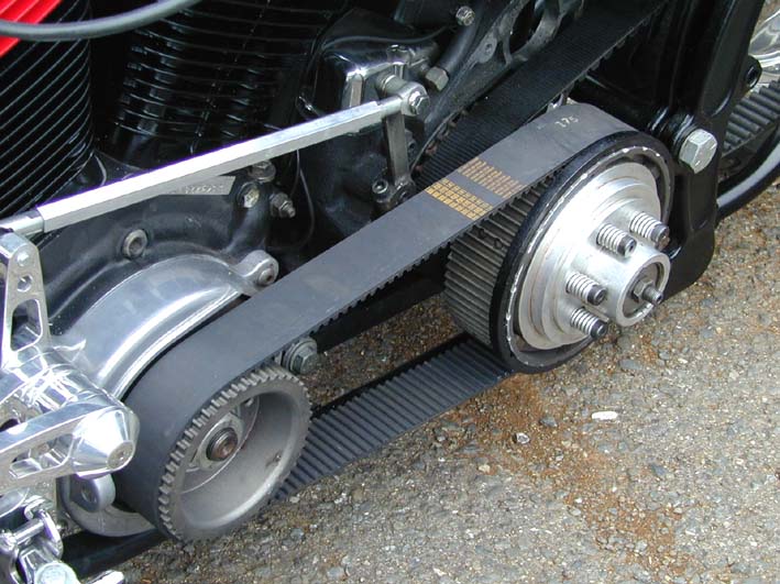 ベース車は一応セルモーター仕様だったのですが,カットされたプライマリーケースの状態がよくなかったので,もっとも手間のかからない楽な方法としてオーナーの意見も無視してキックオンリーに。ベルトガードも取り去って危険一杯のベルト剥き出しです。ちなみに新しいオーナーはキックのみのバイクは初体験だそうです。 セカンダリーもベルトなので連結されたように見えるダブルベルトがワイルドで,たいへんカッコ良いですね。 |