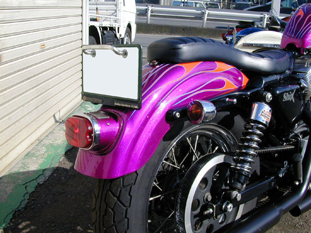 テールランプは当店では大好きなデュオグライドテール。フォルムは現行のテールランプに似てはいても,ボディがスチール製なのでフェンダーに合わせてカラーを揃えたり,溶接で一体化出来たりといろいろ遊べますので,たいへん重宝します。それに適度にオールドテイストが発散され,カッコイイと思いませんか。 しかし,ナンバープレートの荷掛けフックがあまりにも庶民的。 |