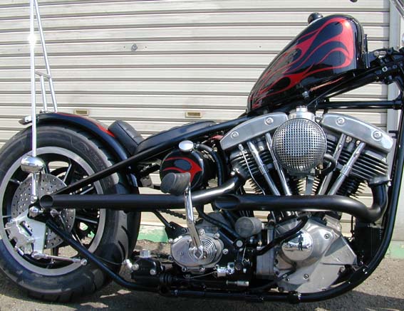 1976年のFXをベースにハードテイルを溶接して製作しましたリジッドチョッパーです。オーナーはダイナローライダーのライトカスタムを所有していましたがショベルエンジンへの興味とスタイルの自由度に憧れて乗り換えました。 スタイル的にはハイパイプのマフラーやキャストホイールからも分かるようにリジッドフレームではありますが,限界まで贅肉を削ぎ落としたスポーティなライトイメージを全面に押し出したチョッパーに仕上げました。(SUキャブなのはご愛嬌) ところで,先日仕事の関係で千葉県の超一流ショップ「Fake」の渡辺氏が恐れ多くもシックスモーターサイクルに来店されたのですが,その時の会話の中で当店のメカニックが自慢げに「名前もぼちぼち知られるようなったし,うちも三流から二流ショップに格上げかな。手始めに大阪から飛び出して東京のショーに殴り込もうと考えているんだけど。」と言ったのですが,渡辺氏に「まだ早いんじゃない?二流には。」とやんわりとたしなめられていたそうです。 |
