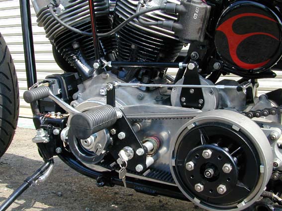 1.5インチベルトのオープンプライマリーに足の位置が高めになるようにベースマウントを造り取り付けましたミッドステップ。 アルミバレルタイプ・オイルタンクは車体色に合わせてペイントしてみました。当店では初めての試みだったのですが,結構イケてますね。 |