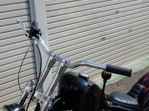 ハンドル周りはナローグライドの8インチライザーにスーパーバーハンドルの組み合せ。ブレーキマスターシリンダーはブラックのNISSIN製。 微妙なラインのスーパーバーハンドルにノーマルのいかにも野暮ったいスイッチボックスは,スポーティなイメージにはマイナス要素だと思えます。 |