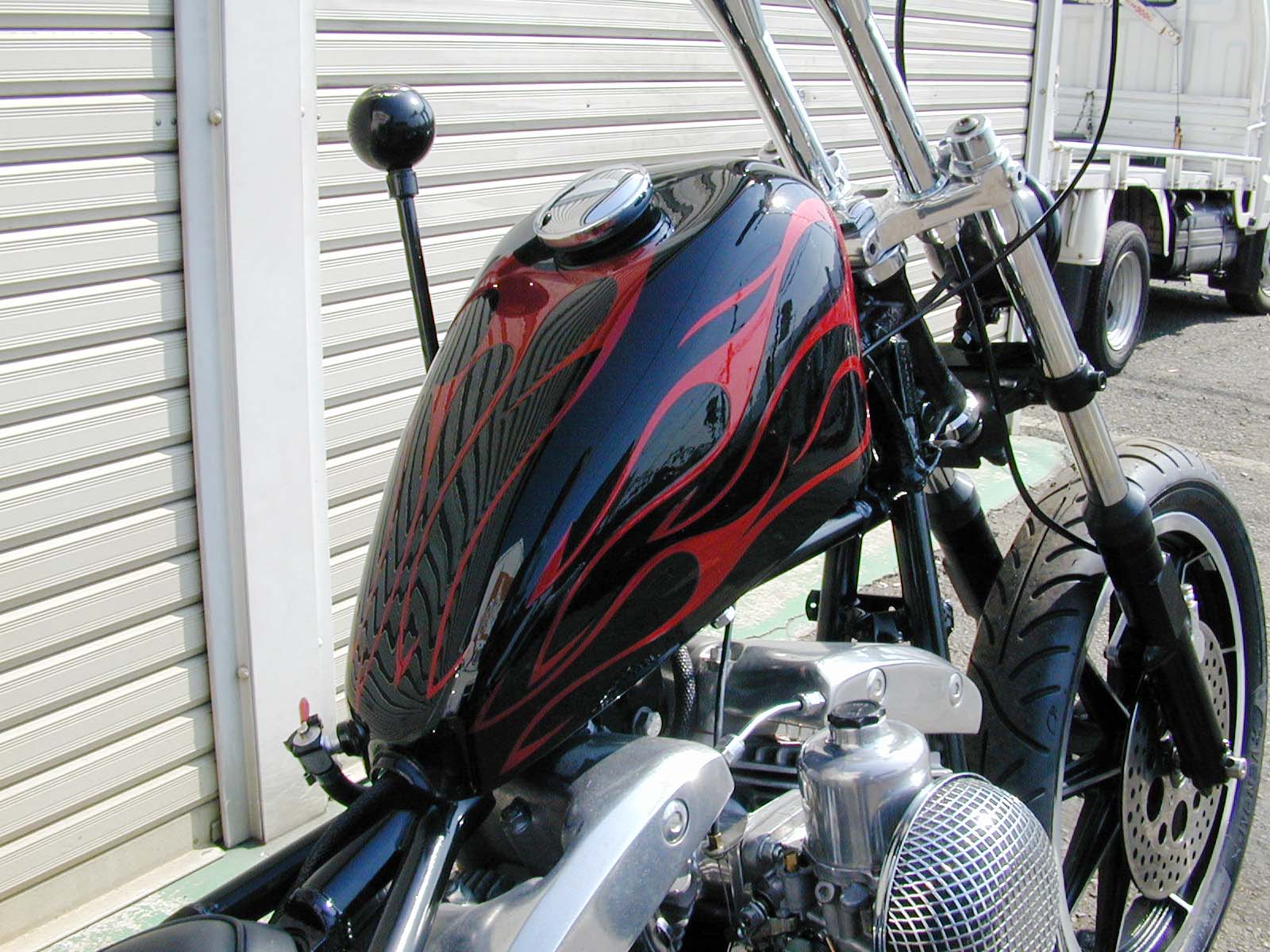 シックスモーターサイクルでは最も登場回数の多いスポーツスタータンクをバランス的にベストな位置にセット。 塗装に関しては今回あえて細かい注文をつけずに「おまかせ」でペイントショップGun Fighterにゆだねました。派手なカラーではありませんが遊び心を取り入れたフレイムパターンでクオリティの高い仕上がりです。 |