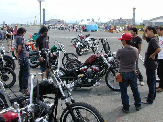 そんな訳で,いつも端っこにいたテントも出店ブースの列の中に参入です。しかもスタッフがこの2週間,睡眠を削って造り上げた新作チョッパーを2台含むカスタムバイク12台をずらりと並べました。