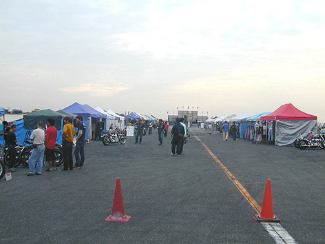 広い飛行場の滑走路の両側にずらりと並ぶ出店ブースの数々と奥に鎮座するイベントステージ。この独特の雰囲気もこれで最後かと思うとちょっぴり寂しく見えます。人の数が少なく見えるのは開場してまだ間もない時間帯だったからで、このイベントは天気に関係なくじわじわとスローペースで毎回始まるんです。 余白 それと、我らがシックスモーターサイクルのいつものブース。
