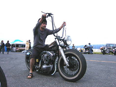 それにちっぽけなリアフェンダー、半分しかないワンオフ・マスタングタンク、40・ほどのショートマフラーにエイプバーの組み合せ。でっかいライトにフォグライトを流用したブレーキライトがマニアック。ブレーキはフロントのみでリアには付いていません。これで、おもいっきりバーンナウトをすると言っていましたが結局見れませんでしたけどね。