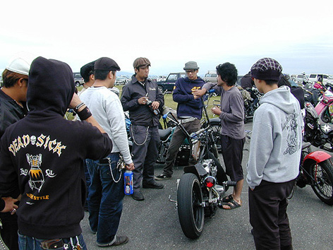 トイレの帰り道、テントサイトで同じ大阪のハーレーカスタムショップ「ギャラップ」のメンバーが和んでいる場所に当店のスタッフが殴り込み、無理やりバイクの自慢を聞かせています。