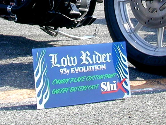 幸いにして仲間内に絵心のある者がいましたので,バイクのイメージに合わせてデザインしてもらいました。 | 余白 | それをバイクの前にちょこんと展示しました。本来ならもっと大きくバイクのスペックなどを書き込むんですが,この仕事が急な思い付きで始まったので,とにかく時間がなく彼には無理をしてもらいました。