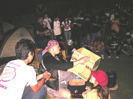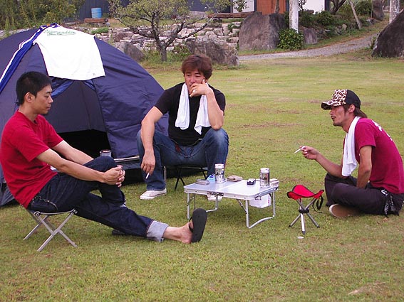 右の人物が主催者の「ケーキ屋さん」こと地職慎介氏。なかなか愛嬌のあるカワイイ、オジさんです。 余白 テントサイトはご覧のようにきっちりと刈り込まれた芝生で実に快適。これなら会話も弾もうというものです。