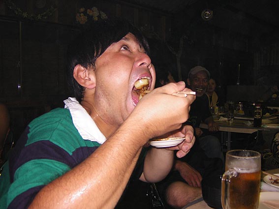 そろそろアルコールも入りテンションも高くなってきました。中央のタンクトップの人物は大阪の48パン・ボバー乗りのTJ氏。昼間、琵琶湖で開催された旧車ミーティングから引き続きの参加ですが、明日仕事があるとかでそのまま帰りました。元気ですね。 余白 左写真の右端の人物のアップ。彼は通称「おやつ君」と呼ばれる地元津山在住のシックスモーターサイクル関係者ですが、まったく見苦しい写真ですな。優雅さのカケラもありません。まぁ、我々らしいといえばそうなんですが。