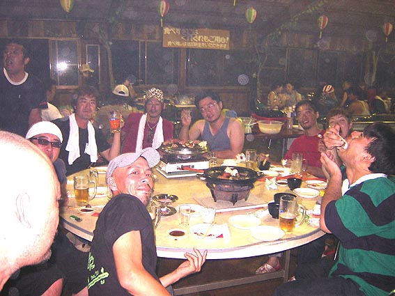 場所をレストランに移して焼肉食い放題。ここでもいろんな人との交流があります。左の人物は兵庫県でレザークラフト「トーチカ」を営んでいます。 余白 シックスモーターサイクルの面々も黙々とお肉を腹の中にかき込んでいきます。使用している焼肉のタレはここの特製でコクがありけっこう美味です。