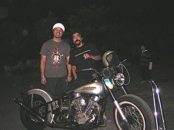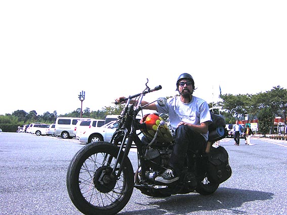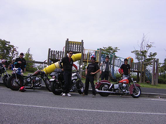 中央の白黒のボバーの前にいるのが私です。このアーリーショベル最近はケムリも目立つようになってきましたが、でもけっこう良く走るので、あまり気にしていません。ちょっとした現実逃避かな? 余白 暑苦しいオッサン連中。下地処理途中のままの外装がカッコ良いのか悪いのか解らないFLHは左の御仁、匿名希望の「前さん」のバイクです。彼も公務員だっていうんですから困ったもんだ。
