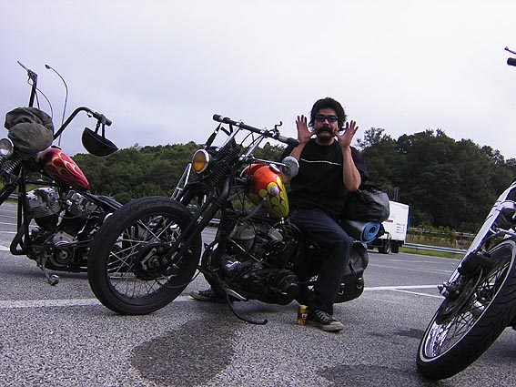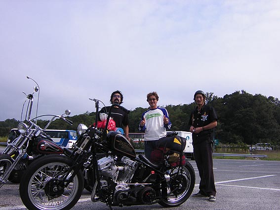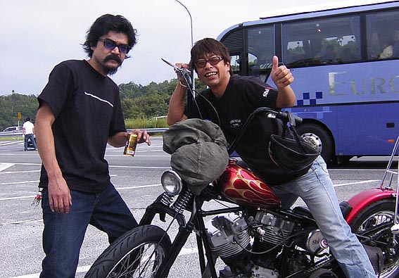 9時過ぎ、待ち合わせの中国自動車道「赤松パーキング」に集まる面々。完成して間もないパンヘッドとオーナーの竹本氏、初の長距離ランです。彼の友人の中川氏はこの時はノーマルのスプリンガーソフテイルだったのですが、この後すぐにチョッパーに乗り換えることに。 余白 最近、仕事の量も増え有名になりつつあるピンストライパー「コンチネンタル」こと岩瀬氏。彼のFXRはシンプルなカッコ良さを追求したカスタムです。その横の赤いチョッパーに乗るのが彼の奥さんであります、通称「オバちゃん」です。写真では小さくてわかりませんがニックネーム通りの人です。