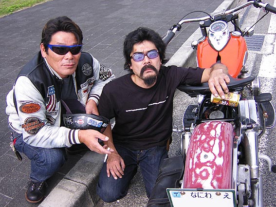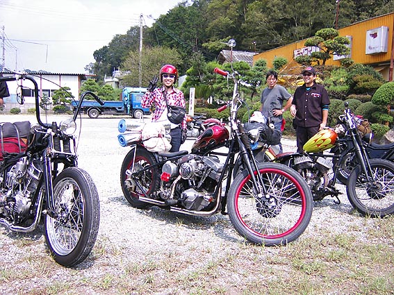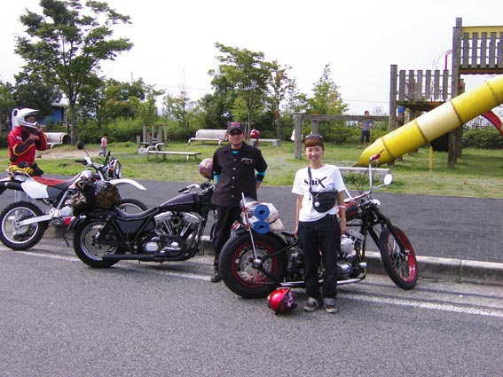 自慢のWLチョッパーに乗るシックスモータサイクルの番頭、西村氏。ヒゲぼうぼうの風貌のわりに、人一倍シャイなのでカメラを向けられると奇妙なポーズで間をごまかす癖があります。彼のWLにはこの後中途半端なトラブルが! 余白 赤いメタルフレークの渋いチョッパーに乗る金子氏。こう見えてもちゃんとした大阪市の公務員。今回は新築間もない一戸建て住宅に奥さんとかわいい子供たちを残しての参加です。通勤にはメタリックブルーのビックスクーターを駆るナイスダディ!