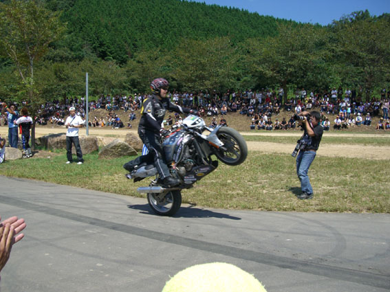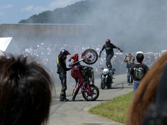 ビューエルを駆るエクストリームショー。軽々とスピンを決めるアクションは同じハーレーとは思えません。 路面に火花を散らしながらブラックマークを刻むテクニックはサイコーでしたね。