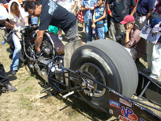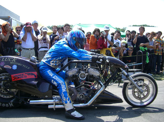 出ました。モノホンのドラッグレーサー。観客も興味しんしんですが、調整でエンジンに火が入りアクセルを開けると爆音で子供達が蜘蛛の子を散らすように逃げて行ったのが面白かったです。 ブルーパンサーの重松氏がデモランに挑みます。河川敷の直線道路を利用しての走行ですが、道路脇に観客がびっしりと押し寄せ、期待が高まります。爆音と共に一瞬の出来事なのですがインパクトのあるイベントです。