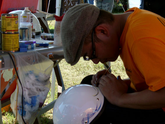 お隣はいつもお世話になりますピンストライパー「コンチネンタル」略して「コンチさん」のブース。初日の朝からヘルメットのピンストオーダーが次々入り大忙しのもよう。 ビールを活力の元に真剣な眼差しで黙々と仕事をこなしていきます。実際、かなり安価な料金設定でオーダーを受け付けていますので2日間共殺人的な仕事量でした。この人もイベントだと俄然燃える性格ですね。