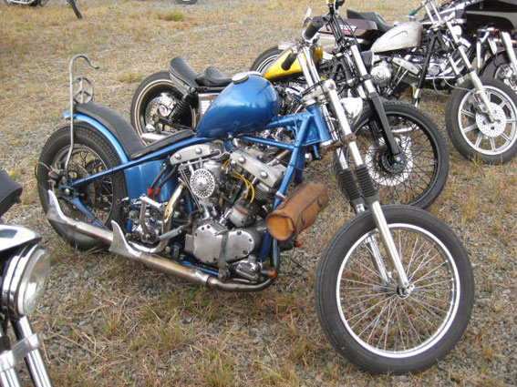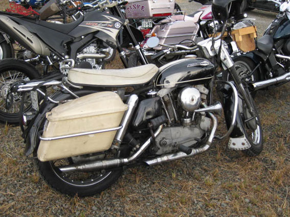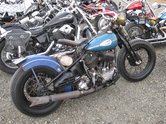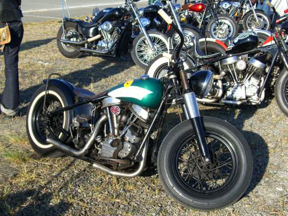 | 乗り手の趣味がモロに反映されたアーリーショベル・チョッパー。モールディングを施されたリジッドフレームにマニア垂涎のフロントまわりのセットアップ。いわくありげなエッグタンクも地面と並行に取り回されたフィッシュテールマフラーもイイですね。ピースフルなシッシーバーが狙い目な一台。 | これだけのハーレーが集まった中でもフルオプションのアイアンスポーツスターは他に見かけませんでした。一般受けはしないかも知れませんが、60年代中期のXLH、ラグジュアリー・アイアンの良さが凝縮された渋いバイクです。モノトーンの配色とヤレたクロームがとっても素敵で私好みです。 |