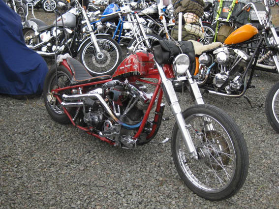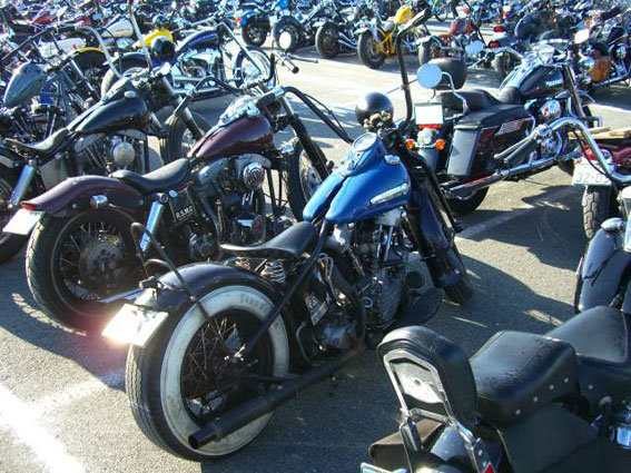 こちらの2台も個性的なセンスが光るビンテージ・チョッパーです。後方の紅白チョッパーはビック・フラットヘッドでめずらしいですよね。手前のパンヘッドもエッグタンクのペイントやシートの造作、オイルタンクの処理など見所一杯。 この2台は行きも帰りも我々と同じ時間帯で走っていたのですが、高速道路ではとてもハイスピードで飛ばすので、あっという間に置いてけぼりを喰らいましたよ。 |