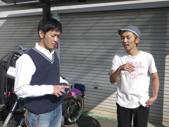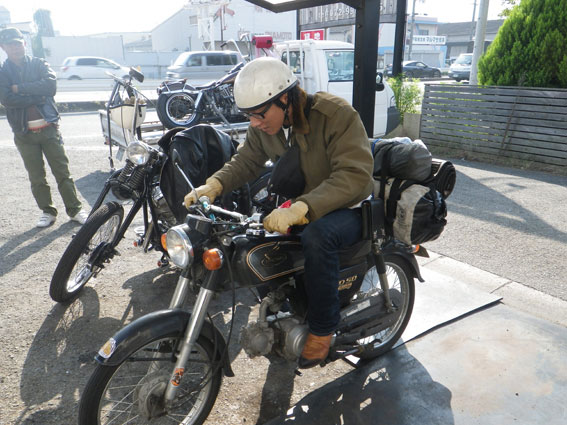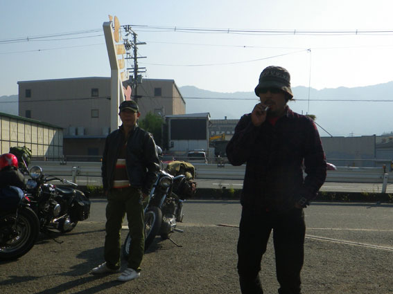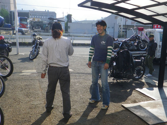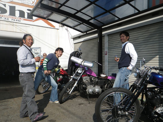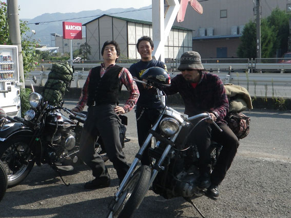 | 白いTシャツに帽子の一人だけチャラい格好でいかにもクルマですというシックスメカニックのタケちゃんは会場にてバイクの受け渡しがあるのでボンゴトラックにバイクを搭載して参加です。クルマが同行するのでバイクにわざわざ荷物をくくりつける必要はないのですが、チョッパーには荷物を載せているほうが「らしい」雰囲気があるということで皆さん荷物を積んでいます。ちなみに私はノーマルスタイルの旧車なので荷物はトラックに載せています。なんとなくノーマル旧車に荷物満載はスマートではないような気がしましたので。もちろんシックス関係者は箱積みスタイルはおりません。箱は確かに便利そうですがハーレーにはやはりバッグが似合います。もしイージーライダーやヘルズエンジェルズの映画が箱を積んでのスタイルだったらどうでしょうか。きっとコアなファンにこれほどリスペクトされることもなかったでしょう。 | |