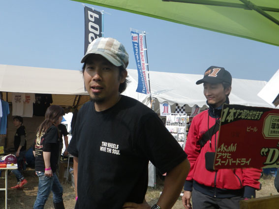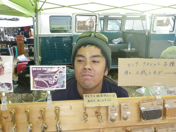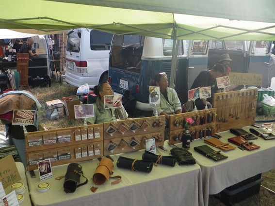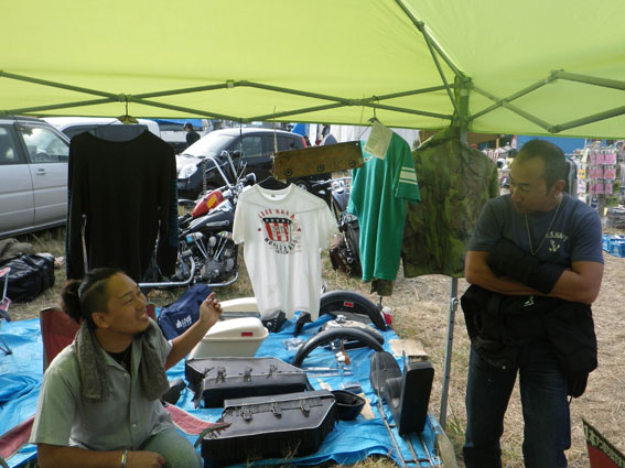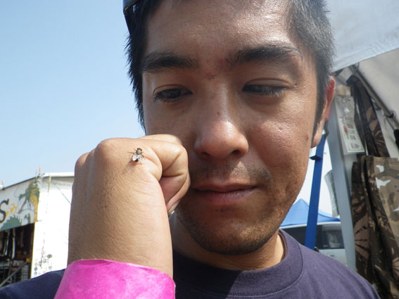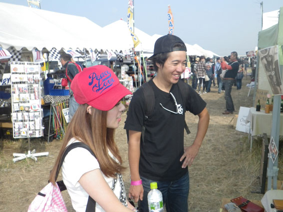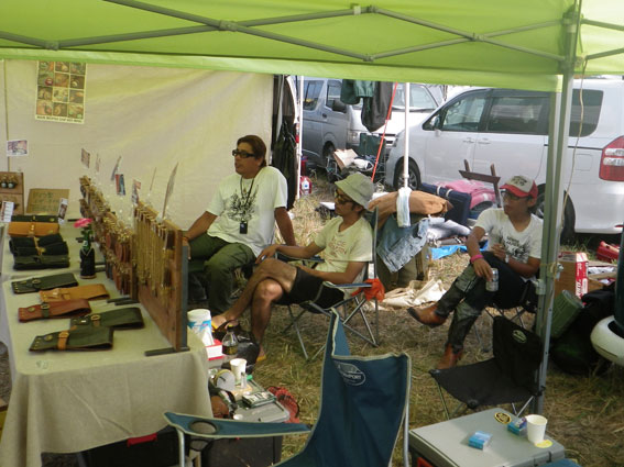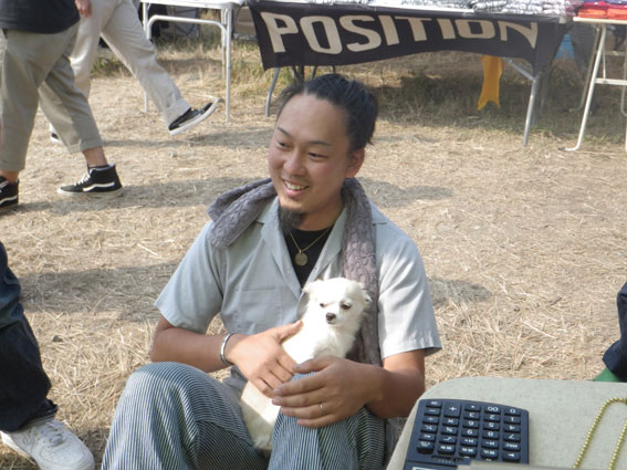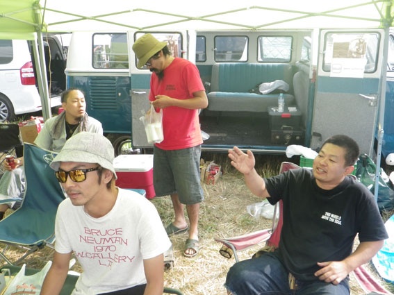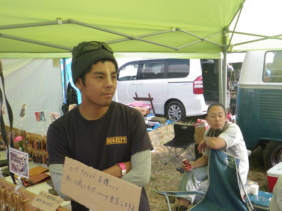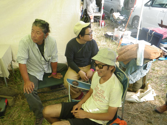 | 3日目、バイブズミーティング最終日。遠方からの来場者は朝早くから次々とテントをたたみバイクに積んで帰る準備を整えています。物販ブースエリアに足を向けるお客さんも目に見えて減っています。しかし、昨日の失態でガロンの売り上げの芳しくなかったツジちゃんは最後の望みを繋いでお客さんの刈り取り作戦に討って出ました。セロテープで鼻筋を通して鼻腔をおっぴろげた顔面パフォーマンスでお客さんの気を引こうという考えだったようですが、雲一つない青空の下往来するお客さんの心はすでにここに無く思いはもう帰宅の途にあり、リアクションに困ったような失笑が出るだけで商品の販売には至りませんでした。 | |