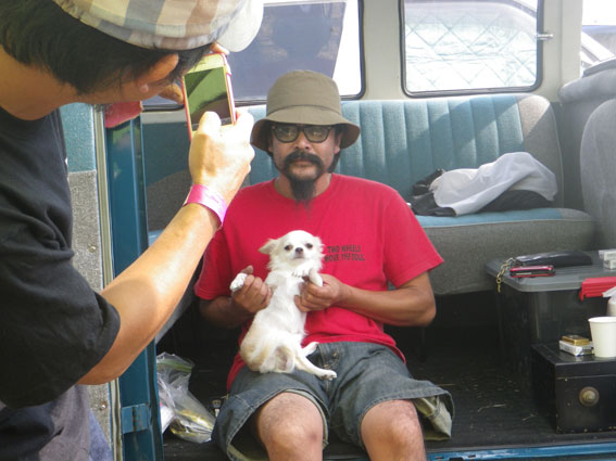 | 最後に再びスラッシュ御一行が、諦めムード一杯のブースに立ち寄ってチワワの耕太郎クンの愛嬌を振りまく慰問会となったところで、シックスモーターサイクルのバイブズミーティングは終了しました。残念ながら自分の意思に反して周りとの温度差が埋まらず終始空回りしていたツジちゃんの出番も終わり、負け犬のような哀れな眼差しで仲間意識が芽生えたのか1匹のハエをただじっと見つめておりましたとさ。 会場内も午後一番には撤収ということもあり、ブース位置的にも比較的撤収しやすい場所でしたので混雑を避けるため少し早い時間でしたが11時過ぎにはバイク組みもクルマ組みも揃って会場を後にしました。 |