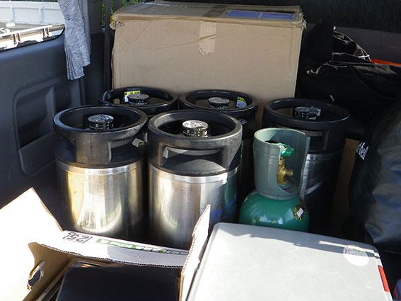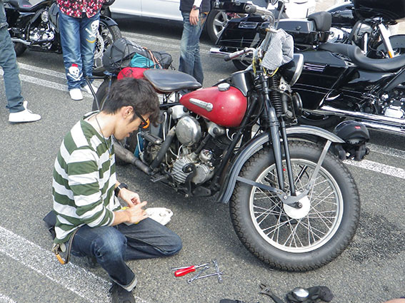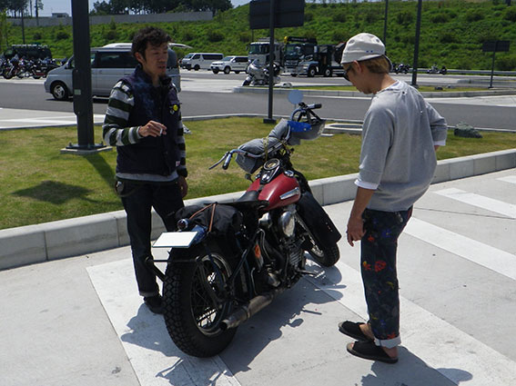 | ワゴン車に販売用のパーツを満載しての出発ですが、車高が極端に低くみえるのは欲張っての過積載ではなく、普段のバイクの積み下ろしが楽なようにとローダウンしたものの勢いあまって下げすぎてしまい、ほぼリジッド状態になってしまったからです。何事もやりすぎには注意しましょう。 ショックの良く効くもう一台の車にはシックスのイベントなら必需品のビールサーバにビールタンクが5本と最初から飲む気十分でいかにシックスが前夜祭に力を入れているかが分かる一コマです。 今回、スタッフのほとんどが車での参加という中、数少ないバイクでの自走組であるナックル君。乗り手の気合は良いのですが、納車からさほど日のたっていない愛車の調子がいまいち良くない様子。特に高速走行に支障があるようで四苦八苦の道中となりました。 |