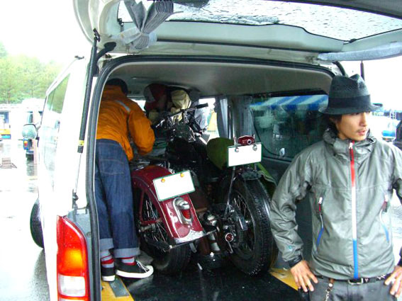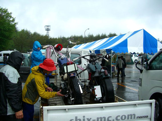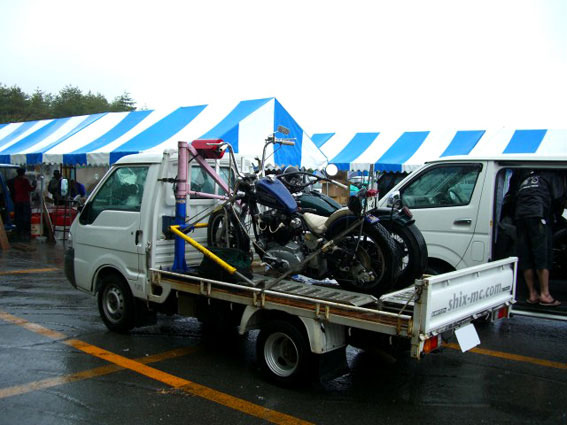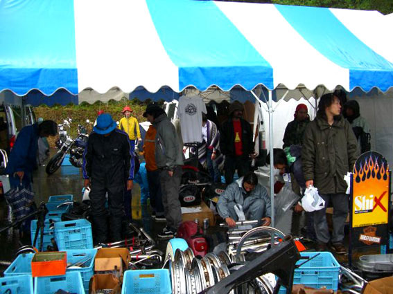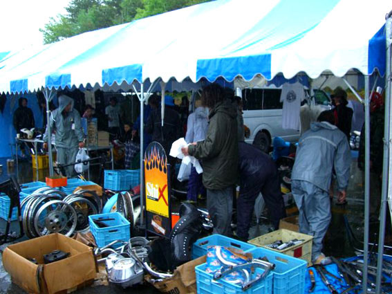 昼からはスワップミートの常で客足も収まると、その隙に納車のチョッパーを送り出すことに。オーナーは天気の良い土曜日にリジッド・ショベルで乗り味を満喫して帰るはずだったのが、シックスのノリに付き合わせれ冷たい雨の中を一人東京へ帰ることになりましたがA-DAYを十分楽しめたことでしょう。 |