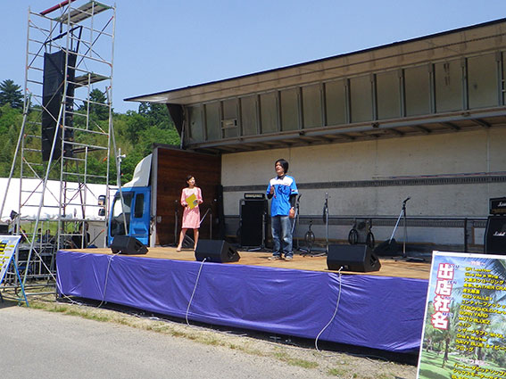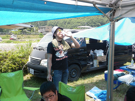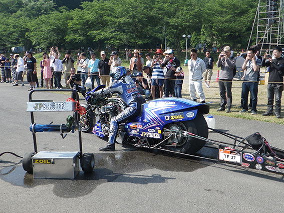 | 時間と共に気温がどんどん上がっていき1日の中で最も暑いのではないかと思われる土曜日のお昼過ぎ、遅めの開会式が行われました。正直、初日の昼間の入場者の入りは少なく、販売店や主催者側の人数の方が多いのではないかと危惧していましたが日が傾くにつれて人の数も増え、泊りのテントサイトも多くの人で夜遅くまで賑わっておりました。もちろん、日曜日の来場者の数はもっと多く、飲食の出店スペースも前記のように繁盛していました。 ただ、来場者のバイクは以前からのイベントの流れでハーレーが多く、その他の外車や国産バイクは少数派でしたので、この新イベントの趣旨が二輪車全般の盛り上げを意図したものならハーレー誌以外のバイク雑誌やクラブにもっと力を入れてPRをすべきだったかも知れません。そんな訳でシックスの読みは完全に外れ持込んだバイクは注目されず商談には至りませんでした。いと悲し。 開会式が終わると恒例のブルーパンサーシゲマツによる迫力あるドラッグレースのデモランが始まります。毎度見応えのあるショーですが今回は特別で初日に昼間と夕方に2回デモランがあり、とっぷり日も暮れた会場でいわゆるナイトデモランが行われました。日中では太陽光の加減で見づらいキャブレターやエキゾーストから弾け飛ぶ炎が見事でいっそう迫力のある光景でした。 |