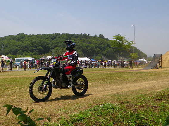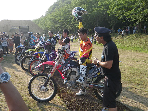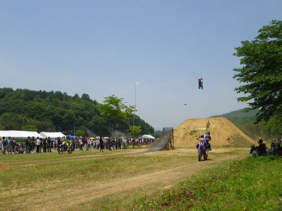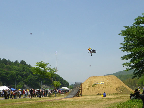 | こちらは大阪城でのイベントを終えたばかりのフリースタイルモトクロスのアクションショー。2日共気温が30度を超える猛暑の中、派手で豪快なトリックを行い完成度の高い技術を披露してくれました。もちろん、フリースタイルモトクロスのMCとして10年以上日本中のイベントをかけずり回っているワダポリスも健在です。見事なトリックが決まるたび観客からは歓声が上がり、暑さと興奮のためかワダポリスのテンションも変な具合に盛り上がり、イベント会場は観客と選手共々熱気に包まれたイベントとなりました。 しかし、シックスの面々は暑さのあまり体力を奪われ素晴らしいトリックに盛り上がりこともなく、皆ぐったりとしておりました。可能なら大阪城のイベントのように気温の下がった夜間にライトアップして競技していただけると嬉しいのですが。 |
